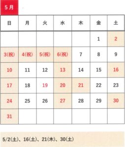 2026年5月は下記の日程で定休日とさせて頂きます。